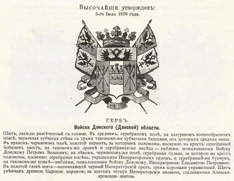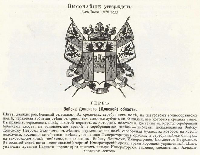 Keywords: Донская обл 1878 из Винклера.jpg Official Russian Empire coat of arms Don Oblast Ге б Российской Импе ии Донской области с официальным описанием в Ге бовнике Винкле а П П фон-Винкле Ге бы го одов губе ний областей и посадов Российской Импе ии внесенные в Полное Соб ание законов с 1649 по 1900 год Дозволено цензу ою С -Пете бу г 20 Июля 1899 года Издание книгото говца Ив Ив Иванова С -Пете бу г Типог афия И Комелова П яжка д 3 1899 \ Scanned 1878 \ 1899 published П П фон Винкле \ Pavel von Vinkler PD-old PD-RusEmpire PD-RU-exempt coats of arms <gallery> File Донская область из Бенке jpg File Донская область ВД Бенке jpg File Донская область изд Сукачова jpg File овоче касск 1878 из Винкле а jpg </gallery> Gerbovnik Vinklera - Governorate Oblast CoAs Coats of arms of Don Oblast |