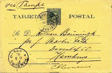 | Keywords: 1896-CubaPostalCard-4c-Hamburg.jpg en 1896 Cuban postal card to Hamburg Germany Used 27 February 1897 The 4 centavos card is rare because the rate to Germany and northern Europe was only 3 centavos The usual practice was to affix a 1 centavo adhesive stamp to a 2 centavos card 1896 Spain for colonial Cuba 1896 Spain for colonial Cuba 1896 PD-old 1896 Postal cards of Cuba Postmarks of Cuba | ||||