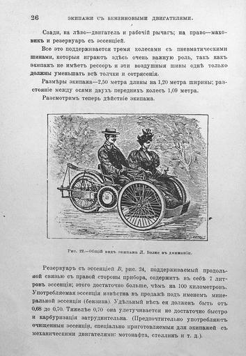 ... Самодвижущиеся экипажи, с паровыми, бензиновыми и электрическими двигателями; экипажи с педалями : Описание их устройства и действия / Н. Песоцкий. - Санкт-Петербург : паровая типо-лит. М.М. Розеноер, 1898. - [6], II, 167 с., 110 ил.; 22.