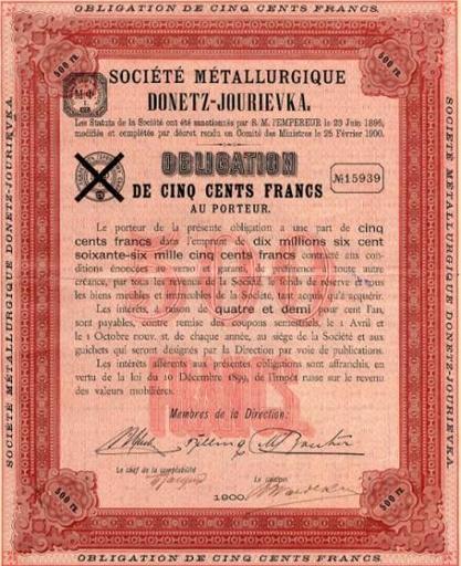| Keywords: 1900. Донецко-Юрьевское металлургическое общество. Облигация в 500 фронков.jpg Донецко-Ю ьевское металлу гическое общество Облигация в 500 ф онков http //infodon org ua/postal/269 1900 author PD-RusEmpire Stock certificates from Luhansk Oblast Files uploaded by Andrew Butko from various sources 19th century Alchevsk Iron Steel Works Images from infodon org ua | ||||