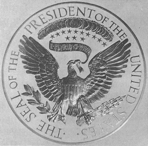 | Keywords: 1903 Martiny US presidential seal.png A bronze plaque of the Seal of the President of the United States made from a model by sculptor Philip Martiny in 1903 and installed in the floor of the north entranceway of the White House directly beneath the lantern during Theodore Roosevelt's administration Also placed in the floor nearby was an inscription of 1792-1902 in an ellipse of 45 stars the number of states at the time During a 1948 renovation President Truman had this plaque moved to above the door to the Diplomatic Reception Room of the White House where it remains today Scanned from page 431 of The Eagle And The Shield 1978 by Richard S Patterson and Richardson Dougall Courtesy of the Office off the Curator the White House January 1903 original plaque Philip Martiny photo by the White House PD-USGov <gallery> File The lobby of the White House by Detroit Photographic Company jpg In its original location File WH Diplomatic Reception Room Door 1952 jpg After being moved in the 1940s File President Bush Oval Office ceiling jpg Ceiling of the Oval Office File Woodrow Wilson Tomb JPG Woodrow Wilson tomb </gallery> Seal of the President of the United States Philip Martiny Diplomatic Reception Room |