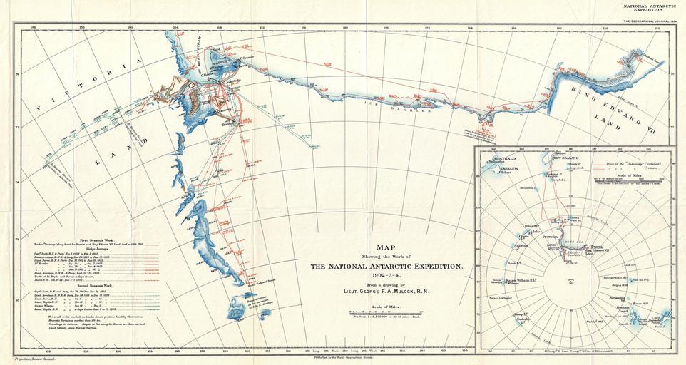 | Keywords: 1904 Antarctic Expedition Map of Victoria Land and King Edward VII Land, Antarctica - Geographicus - AnarcticExp-mulock-1904.jpg This unusual map details the explorations of the British National Antarctic Expedition The British National Antarctic Expedition also known as the Discovery Expedition 1901 “ 1904 was the first official British Exploration of the Antarctic since the explorations of Ross in the mid 19th century Organized as a joint venture between the Royal Society and the Royal Geographical Society the Expedition was designed to collect scientific and geographical data regarding the largely unexplored landmass Considered one of the most important voyages of exploration in the early 20th century this landmark expedition launched the careers of several important Antarctic explorers including Robert Falcon Scott who led the expedition Ernest Shackleton Edward Wilson Frank Wild Tom Crean and William Lashly This map itself follows the coast of Antarctica from Victoria Land eastward along the Ross Ice Shelf to King Edward VII Land Shows the tracks of several important explorers on the expedition as they probed inland toward the South Pole In several cases the explorations followed the Transantarctic Mountains inland Shows the routes taken by Scott Armitage Barne Koettlitz and Royds From a map drawn by Lieutenant George F A Mulock Scott ™s second in command Issued for the 1904 Geographical Journal 1904 dated Size in 26 13 5 object history credit line accession number AnarcticExp-mulock-1904 Royal Geographic Society <i>The Geographical Journal</i> 1904 Geographicus-source PD-art Old maps of Antarctica 1904 maps |