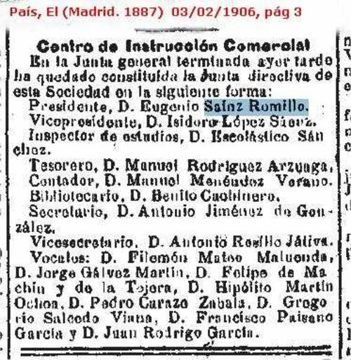 Keywords: 1906-Centro-Instruccion-Comercial-junta-directiva.jpg it Notizia delle nomine della consiglio direttivo del Centro de Instruccion Comercial presidente Eugenio Sainz Romillo 1906-02-03 El Pais Madrid 3 2 1906 pag 3 El Pais other versions El Pais Madrid 3 2 1906 pag 3 Centro de Instruccion Comercial En la junta general terminada ayer tarde ha quedado constituida la junta directiva de esta Sociedad en la siguente forma Presidente D Eugenio Sainz Romillo Vicepresidente D Isidoro Lopez Saenz Inspector de studios D Escolastico Sanchez Tesorero D Manuel Rodriguez Arzuaga Contador D Manuel Menendez Verano Bibliotecario D Benito Cachinero Secretario D Antonio Jimenez de Gonzalez Vicesecretario D Antonio Resillo Jaliva Vocales D Filemon Mateo Maluenda D Jorge Galvez Martin D Felipe de Machin y de la Tejera D Hipolito Martin Ochoa D Pedro Carazo Zabala D Gregorio Salcedo Viana D Francisco Paisano Garcia y D Juan Rodrigo Garcia PD-old Uploaded with UploadWizard Centro de Instruccion Comercial Madrid ImageNote 1 17 29 341 343 373 382 2 El Pais Madrid 3 2 1906 pag 3 Centro de Instruccion Comercial En la junta general terminada ayer tarde ha quedado constituida la junta directiva de esta Sociedad en la siguente forma Presidente D Eugenio Sainz Romillo Vicepresidente D Isidoro Lopez Saenz Inspector de studios D Escolastico Sanchez Tesorero D Manuel Rodriguez Arzuaga Contador D Manuel Menendez Verano Bibliotecario D Benito Cachinero Secretario D Antonio Jimenez de Gonzalez Vicesecretario D Antonio Resillo Jaliva Vocales D Filemon Mateo Maluenda D Jorge Galvez Martin D Felipe de Machin y de la Tejera D Hipolito Martin Ochoa D Pedro Carazo Zabala D Gregorio Salcedo Viana D Francisco Paisano Garcia y D Juan Rodrigo Garcia ImageNoteEnd 1 |