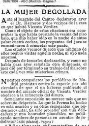 | Keywords: 1907-07-09-ABC-stampa-sotto-accusa.jpg es LA MUJER DEGOLLADA Ante el Juzgado del Centro declararon ayer el Dr Herreros y dos vecinos de la casa en que abitò Vicenta Verdier Como el objeto de estas citaciones era comprobar la que habia prestado la vecina del piso bajo que dijo de haber oido en la noche de autos parar cuatro coches las preguntas del juez se encaminaron à concretar este punto Los citados vecinos dijeron que ninguno de ellos recibiò visitas aquella noche ni oyò nada anormal Despues de tomarles declaracion y como no habia para ayer señalada otra diligencia el juez diò por terminado su trabajo del dia sobre este cada vez mà s misterioso crimen - - - - Nuestros compañeros los periodicos de Madrid protestan contra la especie por ahi circulada de que el no haberse publicado el nombre del amante oficial de Vicenta Verdier obedece à la influencia del dinero Semejante suposicion no merece mà s que un soberano desprecio Lo que la Prensa ha hecho en esta ocasion y en otras semejantes que pudieramos citar ha sido proceder con una delicadeza y una honradez plausibles no publicando nombres de personas en asuntos de indagines it Articolo del quotidiano ABC di Madrid del 7 9 1907 riferentesi al crimen de la calle de los Tudescos in cui si la stampa si difende dalla falsa accusa di aver taciuto per denaro il nome dell'amante di Vicenta Verdier la vittima morta sgozzata LA DONNA SGOZZATA Davanti al tribunale del Centro deposero ieri il Dott Herreros e due vicini della casa in cui abitò Vicenta Verdier Le domande del giudice istruttore erano finalizzate a verificare le affermazioni della vicina del piano di sotto che aveva dichiarato che la notte del delitto aveva sentito fermarsi quattro automobili sotto casa I citati vicini dissero che nessuno di loro ricevette visite quella notte e neppure avvertirono qualcosa di anormale Dopo aver preso queste deposizioni non avendo nessun'altra segnalazione da verificare per ieri il giudice ritenne concluso il suo lavoro del giorno su questo delitto sempre più misterioso - - - - - - - - I nostri compagni dei giornali di Madrid protestano contro la voce qui circolata che il fatto di non aver pubblicato subito il nome dell ™amante ufficiale di Vicenta Verdier fosse imputabile all ™influenza del denaro Simili supposizioni non meritano altro che un sovrano disprezzo Quello che la stampa ha fatto in questa occasione e in altre simili che potremmo citare è stato di procedere con una delicatezza e una onorabilità comprensibili non pubblicando nomi di persone durante le indagini preliminari 1907-07-09 own Albertomos PD-old ABC Madrid El crimen de la calle de los Tudescos Madrid Uploaded with UploadWizard ImageNote 1 1 16 455 620 457 647 2 LA MUJER DEGOLLADA Ante el Juzgado del Centro declararon ayer el Dr Herreros y dos vecinos de la casa en que abitò Vicenta Verdier Como el objeto de estas citaciones era comprobar la que habia prestado la vecina del piso bajo que dijo de haber oido en la noche de autos parar cuatro coches las preguntas del juez se encaminaron à concretar este punto Los citados vecinos dijeron que ninguno de ellos recibiò visitas aquella noche ni oyò nada anormal Despues de tomarles declaracion y como no habia para ayer señalada otra diligencia el juez diò por terminado su trabajo del dia sobre este cada vez mà s misterioso crimen - - - - Nuestros compañeros los periodicos de Madrid protestan contra la especie por ahi circulada de que el no haberse publicado el nombre del amante oficial de Vicenta Verdier obedece à la influencia del dinero Semejante suposicion no merece mà s que un soberano desprecio Lo que la Prensa ha hecho en esta ocasion y en otras semejantes que pudieramos citar ha sido proceder con una delicadeza y una honradez plausibles no publicando nombres de personas en asuntos de indagines ImageNoteEnd 1 |