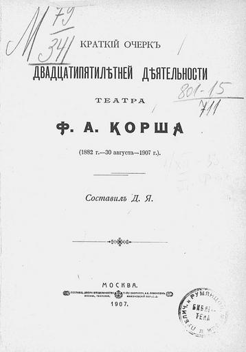 | Keywords: 1907 театр корша театркорша история русского театра историярусскоготеатра ргб российская государственная библиотека российскаягосударственнаябиблиотека российская империя российскаяимперия russian state library russianstatelibrary rsl history of russian theatre historyofrussiantheatre blackandwhite monochrome text writing black and white Источник: РГБ Языков, Дмитрий Дмитриевич (-1919). Краткий очерк двадцатипятилетней деятельности Театра Ф.А. Корша : (1882 г. - 30 авг. - 1907 г.) / Сост. Д.Я. - Москва : т-во скоропеч. А.А. Левенсон, 1907. - 100 с., 2 л. портр. : портр.; 18. Авт. установлен по изд.: Масанов И.Ф. Словарь псевдонимов... М., 1956. Т. 1. С. 319 Загл. обл.: XXV лет деятельности. Театр Корша dlib.rsl.ru/rsl01003000000/rsl01003745000/rsl01003745953/... Источник: РГБ Языков, Дмитрий Дмитриевич (-1919). Краткий очерк двадцатипятилетней деятельности Театра Ф.А. Корша : (1882 г. - 30 авг. - 1907 г.) / Сост. Д.Я. - Москва : т-во скоропеч. А.А. Левенсон, 1907. - 100 с., 2 л. портр. : портр.; 18. Авт. установлен по изд.: Масанов И.Ф. Словарь псевдонимов... М., 1956. Т. 1. С. 319 Загл. обл.: XXV лет деятельности. Театр Корша dlib.rsl.ru/rsl01003000000/rsl01003745000/rsl01003745953/... |