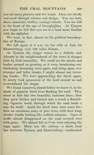 | Keywords: пекин-париж пекинпариж 1907 pekin-paris pekinparis barzini автогонка book race барцини itala internet archive internetarchive university of toronto universityoftoronto english peking-paris pekingparis text document writing В Сибири магазинные обозначения или торговые знаки встречаются гораздо чаще, чем надписи, даже в крупных городах; вокруг магазинов вы увидите много рисунков и всего несколько слов. Идеи, главным образом, передаются с помощью рисунков и оформления. Вы видите рисунки головных уборов, обуви, самоваров, одежды, экипажных колёс. Вы все еще в самом сердце эпохи иероглифов или символов. В Тюмени вы начинаете чувствовать, что находитесь в стране, которой ближе алфавит. Мы были действительно почти на политической границе Европы. ... 19 июля в 4 часа утра мы вновь отправились в путь по направлению к Екатеринбургу, нам предстояло преодолеть более 120 миль. Тюмень - своего рода граница степи, уже на подступах к ней мало-помалу и незаметно мы попадаем в иную зону. Мы могли видеть кустарники и кусты, растущие вокруг нас, которые становились шире, гуще, постепенно превращаясь в деревья, те в свою очередь становились сильнее и выше, я бы сказал, достигая почти огромных размеров. Мы вновь приближались к лесу. Он медленно и постепенно охватывал и подавлял степь. И вот мы неожиданно оказались в тени гигантских берез, стоящих по краю дороги. Они выглядели, прежде всего, как две красивые большие линии, но были толстыми и разворачивались в сторону леса, густого настоящего леса, через который и лежал наш путь. Среди берез стояло несколько елей, а за ними бесчисленная армия сосен с их длинными тонкими стволами, напоминающими колонны из красноватого мрамора. Трава почти скрыла какие-либо признаки дороги. Нам казалось, точно мы вновь въезжаем в тайгу. Неподалёку проходила небольшая локальная железная дорога, связывающая Тюмень и Екатеринбург... In Siberia the shop-signs are much more numerous than the inscriptions, even in the large towns; round the shopsround the shops you see many pictures and few words. Ideas are chiefly conveyed through colours and design. You see hats, shoes, samovars, clothes. carriage-wheels. You are still in the heart of the age of hieroglyphics. At Tjumen you begin to feel that you are in a land more familiar with the alphabet. We were, in fact, almost on the political boundary—line of Europe. ... We left again at 4 a.m. on 19th of July for Ekaterinburg, over 120 miles distant. At Tjumen the steppe comes to a definite end. Already in the neighbourhood of the town it changes little by little insensibly. We could see the shrubs and bushes around us growing, as it were, broadening out, thickening, becoming trees again, and rising upon ever stronger and taller trunks, i might almost say towering trunks. We were approaching the forest again. It slowly took possesion of the land around us and overwhelmed the steppe. We found ourselves, almost before we knew it, in the shade of gigantic birch trees flanking the road. They stood at first like two beautiful, immense lines then they grew thicker and turned into the wood, a flourishing, vigorous wood, through which the road made a way for itself. Amid the birch trees were some firs; then an enormous army of pine trees, with there long, slender trunks looking like reddish columns. Signs of traffic almost disappeared on the road covered over with grass. We almost felt as if we were entering the taiga again. Here, too, the railway - a short, local line between Tjumen and Ekaterinburg - condemned Source (PDF): ia600203.us.archive.org/2/items/pekintoparisacco00barz/pe... (2011) To the Ends of the Earth Written by Matthew Hocker www.aacalibrary.org/articles/antique-automobile/to-the-en... В Сибири магазинные обозначения или торговые знаки встречаются гораздо чаще, чем надписи, даже в крупных городах; вокруг магазинов вы увидите много рисунков и всего несколько слов. Идеи, главным образом, передаются с помощью рисунков и оформления. Вы видите рисунки головных уборов, обуви, самоваров, одежды, экипажных колёс. Вы все еще в самом сердце эпохи иероглифов или символов. В Тюмени вы начинаете чувствовать, что находитесь в стране, которой ближе алфавит. Мы были действительно почти