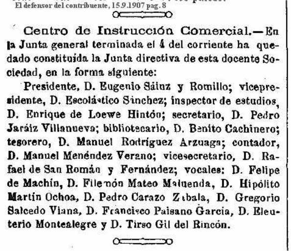 Keywords: 1907-Centro-Instruccion-Comercial-junta-directiva.jpg it Notizia delle nomine della consiglio direttivo del Centro de Instruccion Comercial presidente Eugenio Sainz Romillo 1907-09-15 El defensor del contribuente 15 9 1907 pag 8 El defensor del contribuente other versions El defensor del contribuente 15 9 1907 pag 8 Centro de Instruccion Comercial En la junta general terminada el 4 del corriente ha quedado constituida la Junta directiva de esta docente Sociedad en la forma siguente Presidente D Eugenio Sainz y Romillo Vicepresidente D Escolastico Sanchez Inspector de studios D Enrique de Loewe Hinton; Secretario D Pedro Jaraiz Villanueva; Bibliotecario D Benito Cachinero Tesorero D Manuel Rodriguez Arzuaga; Contador D Manuel Menendez Verano; Vicesecretario D Rafael de San Roman y Fernandez; Vocales D Felipe de Machin Fiemon Mateo Maluenda D Hipolito Martin Ochoa D Pedro Carazo Zabala D Gregorio Salcedo Viana D Francisco Paisano Garcia D Eleuterio Montealegre y D Tirso Gil del Rincon PD-old Uploaded with UploadWizard Centro de Instruccion Comercial Madrid El defensor del contribuente ImageNote 1 21 20 443 368 477 411 2 El defensor del contribuente 15 9 1907 pag 8 Centro de Instruccion Comercial En la junta general terminada el 4 del corriente ha quedado constituida la Junta directiva de esta docente Sociedad en la forma siguente Presidente D Eugenio Sainz y Romillo Vicepresidente D Escolastico Sanchez Inspector de studios D Enrique de Loewe Hinton; Secretario D Pedro Jaraiz Villanueva; Bibliotecario D Benito Cachinero Tesorero D Manuel Rodriguez Arzuaga; Contador D Manuel Menendez Verano; Vicesecretario D Rafael de San Roman y Fernandez; Vocales D Felipe de Machin Fiemon Mateo Maluenda D Hipolito Martin Ochoa D Pedro Carazo Zabala D Gregorio Salcedo Viana D Francisco Paisano Garcia D Eleuterio Montealegre y D Tirso Gil del Rincon ImageNoteEnd 1 |