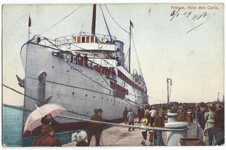 | Keywords: 19090108 trieste molo san carlo.jpg fr Vue de Trieste au début du XXe siècle 1909-01-08 dated by the sender of the postcard Vintage postcards private collection author other versions PD-old-70-1923 Port of Trieste Thalia ship 1886 Ships in Trieste Molo Audace Trieste Postcards of Austria-Hungary Stabilimento editore Milan Mandich Trieste 000511 Trieste in the 1900s Postcards uploaded by user Jean Housen Uploaded with UploadWizard | ||||