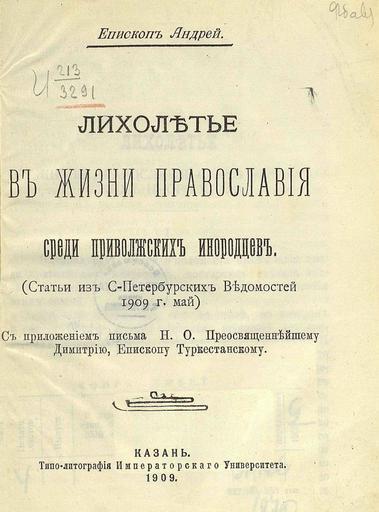 Лихолетье в жизни православия среди приволжских инородцев : (Ст. из С.-Петерб. вед. 1909 г. май) : С прил. письма Н.О. преосвященнейшему Димитрию, еп. Туркестанскому / Еп. Андрей. - Казань : типо-лит. Имп. ун-та, 1909. - 62 с.; 18.
