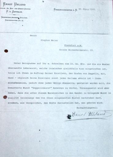 | Keywords: 1909 Genehmigungsschreiben.jpg en Permission to use the name Zeppelin for the product Zeppelinwurst de Genehmigung das Produkt Zeppelinwurst nach dem Grafen von Zeppelin zu benennen Festplattenupload Ernst Uhland 1909 1909 PD-old Sausages of Germany |