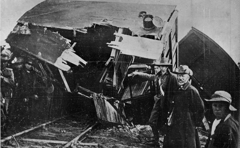 Keywords: tasmania blackandwhite monochrome outdoor black and white Derailment of a troop train north of Andover. Smashed horse box. C J Fox photo Derailment of a troop train north of Andover. Smashed horse box. C J Fox photo
