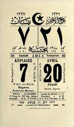 | Keywords: 1911 Ottoman Calendar.jpg Rumi date in Ottoman Turkish year 1327 lang tr Nisan 7 ota ٧ نیسان ١٣٢٧ </li> <li>The same Julian date 7 April el ΑΠΡΙΛΙΟΣ 7 and day Thursday el Πέμ τη appears below in Greek with the AD year 1911</li> <li>Next to that is the Gregorian date 20 April fr AVRIL 20 and day fr Jeudi in French</li> <li>Above these two is the date 30 April sr 30 Ап илий and day Thursday sr Четвъ тъкъ in Serbian</li> <li>Under the Greek is Armenian reading April hy ԱՊՐԻԼ and Thursday hy ԻՆԳՇԱԲԹԻ </li> <li>The upper right shows the Islamic date ar-Latn 21 Rebiülahir 1329 ar ١٣٢٩ ربيع الآخر أو ١٢ </li> <li>The Hebrew date 22 Nisan 5671 he 22 ניסן 5671 appears at the bottom </li> </ul> date rumi en turc ottoman l'année 1327 lang tr Nisan 7 ota ٧ نیسان ١٣٢٧ </li> <li>La même date julienne 7 avril el ΑΠΡΙΛΙΟΣ 7 et jour jeudi el Πέμ τη apparaît ci-dessous en grec avec l'année AD 1911</li> <li> côté se trouve la date grégorienne 20 avril et jour jeudi en français</li> <li>Au-dessus de ces deux est la date 30 avril sr 30 Ап илий et jour jeudi sr Четвъ тъкъ en serbe</li> <li>Sous le grec est arménien avril hy ԱՊՐԻԼ et jeudi hy ԻՆԳՇԱԲԹԻ </li> <li>La partie supérieure droite montre la date musulman ar-Latn 21 Rebiülahir 1329 ar ١٣٢٩ ربيع الآخر أو ١٢ </li> <li>La date hébraïque 22 Nisan 5671 he 22 ניסן 5671 apparaît en bas </li> </ul> 2016-06-26 1911 Ottoman calendar author PD-Ottoman Empire PD-old-100 Ottoman Empire in the 1910s |