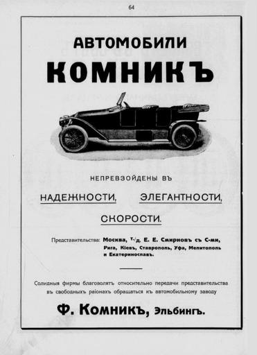 | Keywords: 1914 автомобилист ргб российский журнал российскийжурнал russian state library russianstatelibrary rsl automobilist advertising комник komnick blackandwhite monochrome text writing black and white dlib.rsl.ru/rsl60000000000/rsl60000099000/rsl60000099156/... Кто помнит «Комник»? Марка Komnick из Восточной Пруссии и Первый Всесоюзный испытательный автомобильный и мотоциклетный пробег Станислав Кирилец (Stanislav Kiriletz, Германия), иллюстрации из архива автора и Кристы Мюльайзен (Christa Mhleisen, Германия). «Комник»? Разве были такие автомобили? Этот вопрос можно услышать даже от людей, компетентных в автомобильной истории. Немногие знают что-либо об этих машинах, выпускавшихся когда-то в Германии. Сотни автомобильных заводов и фабрик, игравших в свое время немалую роль в истории автомобилизма, сейчас незаслуженно забыты. Среди них и автомобили «Комник» из Восточной Пруссии с черным «тевтонским» крестом на эмблеме. Уроженец села Траппенфельде, сын кузнеца и оружейника, коммерции советник, доктор-инженер Франц Комник (Franz Komnick, 1857–1938 гг.) с юных лет научился кузнечному и слесарному ремеслу в мастерской своего отца. Он работал на крупных германских машиностроительных заводах Egerstorff в Ганновере (позже известен как «Ганомаг» – Hanomag), Hohenzollern AG в Дюссельдорфе, Borsig и Eckert в Берлине. Вернувшись на восток в 26 лет, Франц Комник основал в городке Ладекопп (Ladekopp) небольшую механическую ремонтную мастерскую. В 1891 г. в Нейштадте (Neustadt) Комник открыл новую мастерскую, которая в скором времени превратилась в настоящую машиностроительную фабрику со штатом 150 рабочих и служащих. Вскоре он продал фабрику и поступил на должность инженера на «Восточно-Германскую машиностроительную фабрику» в городе Хейлигенбейль (Ostdeutsche Maschinenfabrik, Heiligenbeil), где проработал до 1898 г. В том же году Франц Комник купил «Машиностроительную фабрику Хотоп» (Maschinenfabrik Hotop) в Эльбинге – так под новым именем F. Komnick vorm. Hotop началась история фирмы «Комник» – с постройки сельскохозяйственных орудий, паровых котлов и машин и камнедробилок. Франц Комник своевременно понял преимущества технической революции начала ХХ века – быстрое развитие автомобильной промышленности в Германии, и в 1906 г. он решил заняться производством автомобилей. Он приобрел на окраине Эльбинга бывшую текстильную фабрику с огромной территорией, примыкающей к железной дороге, – там сразу же началось строительство большого автомобильного завода. В 1907 г. из новых заводских цехов фирмы с новым названием «Automobilfabrik F. Komnick» выехали первые легковые автомобили Komnick собственной конструкции, годом позже началось производство моторных плугов. Машины Komnick сразу же зарекомендовали себя с лучшей стороны, изящные и надежные, они быстро нашли своих покупателей не только в Германии, но и в других странах, в первую очередь в Российской империи. Популярности их не в последнюю очередь содействовали многочисленные спортивные успехи в международных пробегах 1907–1912 гг. Награды, полученные заводскими гонщиками (в числе которых был и старший сын основателя фирмы Бруно Комник (Bruno Komnick) в таких престижных соревнованиях, как пробеги на приз Принца Генриха в Германии и на приз императора Николая II в России, способствовали хорошему сбыту автомобилей. В 1909 г. в СанктПетербурге открылась первая агентура по продаже автомобилей Komnick, ее возглавил г-н Гильгендорф, позже к продажам этих машин подключился и известный в столице «Гараж Наган». По 