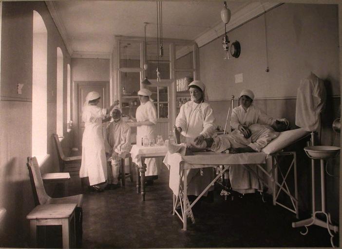 View Original:1914. 23. Медицинские сестры за перевязкой раненых в перевязочной французского госпиталя св.Екатерины.jpg (2348x1712)