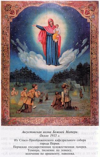 Keywords: 1915. Августовская икона Божией Матери (Пермь).jpg Августовская икона Божией ате и из Спасо-П еоб аженского кафед ального собо а Пе ми Х анится в Пе мской госуда ственной художественной гале ее Темпе а тиснение по левкасу золочение по о наменту паволока http //fotki yandex ru/next/users/kondoribbrat/album/105224/view/518364 1915 author PD-RusEmpire Theotokos of Augustów Religion in Perm Transfiguration Cathedral in Perm