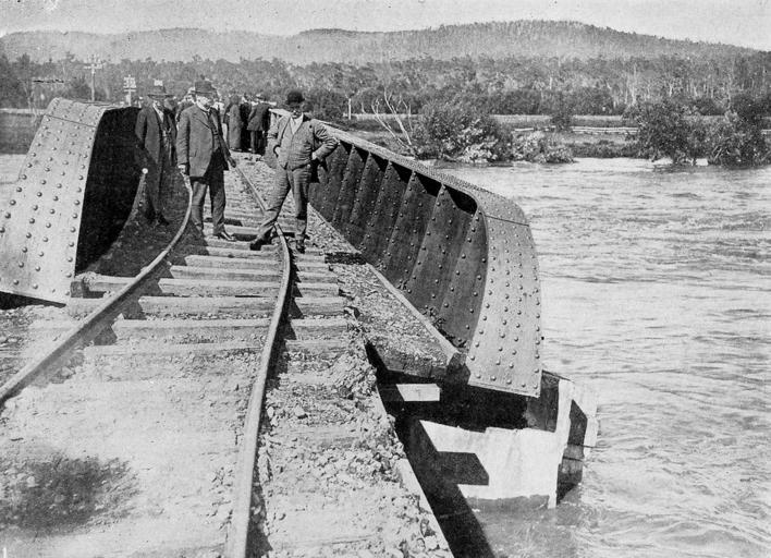 Keywords: tasmania blackandwhite monochrome outdoor black and white Flood damage to Latrobe railway bridge Flood damage to Latrobe railway bridge
