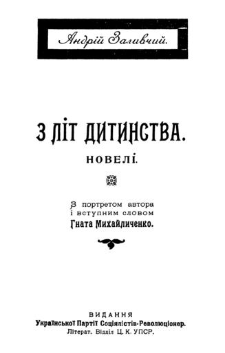 | Keywords: З літ дитинства 1919.png Титульний лист збі ки новел Анд ія Заливчого «З літ дитинства» 1919 Заливчий Анд ій З літ дитинства новелі / з по т авто а і вступ словом Гната ихайличенко Київ Вид Ук Па тії Соціялістів-Революціоне ів ; Д ук І Кушне ева та Спілки 1919 32 с 1919 Анд ій Заливчий scan ocr by AMY <span class signature-talk ></span> PD-Art Andrii Zalyvchyi |