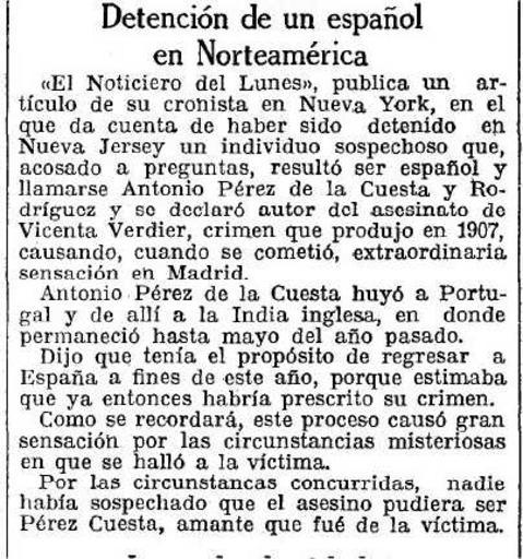 Keywords: 1927-02-15-Vanguardia-detencion-de-un-español-en-Norteamerica.jpg it Articolo di stampa apparso su La Vanguardia del 15 2 1927 in cui si dà notizia dell'arresto in New Jersey di tale Antonio Perez de la Cuesta uno spagnolo che millanta di essere l'assassino di Vicenta Verdier al solo scopo di farsi rimpatriare gratis in patria dalle autorità 1927-02-15 La Vanguardia Barcelona 15 2 1927 pag 23 La Vanguardia DETENCION DE UN ESPAÑOL EN NORTAMERICA El Noticiero del Lunes publica un articolo de su cronista en Nueva York en el que da cuenta de haber sido detenido en New Jersey un individuo sospechoso que acosado a preguntas resultò ser español y llamarse Antonio Perez de la Cuesta y Rodriguez y se declarò autor del asesinato de Vicenta Verdier crimen que se produjo en 1907 causando cuando se cometiò extraordinaria sensacion en Madrid Antonio Perez de la Cuesta huyò a Portugal y de allì a la India inglesa en donde permaneciò hasta mayo del año pasado Dijo que tenia el proposito de regresar a España a fines de este año porque estimaba que ya entonces habria prescrito su crimen Como se recordarà este proceso causò gran sensacion por las circustancias misteriosas en que se hallò a la victima Por las circustancias concurridas nadie habia sospechado que el asesino pudiera ser Perez Cuesta amante que fuè de la victima DETENZIONE DI UNO SPAGNOLO IN NORDAMERICA Il Notiziario del Lunedì pubblica un articolo del suo cronista di New York in cui racconta che un individuo sospetto è stato arrestato in New Jersey che interrogato risultò essere spagnolo e chiamarsi Antonio Perez de la Cuesta e si dichiarò autore dell ™assassinio di Vicenta Verdier delitto commesso nel 1907 provocando a suo tempo straordinaria sensazione in Madrid Antonio Perez de la Cuesta fuggi in Portogallo e da lì andò nelle Indie inglesi dove soggiornò fino a maggio dell ™anno scorso Disse di aver il proposito di ritornare in Spagna alla fine di quest ™anno perché pensava che per allora sarebbe già prescritto il suo crimine Come si ricorderà questo fatto provocò grande sensazione per le circostanze misteriose in cui fu trovata la vittima Date le circostanze nessuno poteva sospettare che l ™assassino potesse essere Perez Cuesta che fu amante della vittima n d r che fu amante della vittima è una notizia priva di fondamento PD-old La Vanguardia news 1927 El crimen de la calle de los Tudescos Madrid 1927 in Spain Uploaded with UploadWizard |