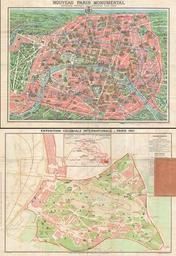 Keywords: 1931 Leconte Map of Paris w-Monuments and Map of the Exposition Coloniale - Geographicus - Paris-leconte-1931.jpg This is an extremely attractive 1931 tourist pocket map of Paris France Covers the old walled city of Paris and the immediate vicinity Drawn in a lavish art deco style with important buildings are shown in profile including the Eiffel Tower the Arc de Triomphe Sacre-Coeur the Pantheon and others Shows both the train and Metro lines throughout the city This map was issued in various editions from roughly 1900 to 1937 This example is exceptional in that it was issued in 1931 the year Paris hosted its International Colonial Exposition a map of which appears of the verso This incredible event which was held in the Bois de Vincennes lasted six months and drew nearly 33 million visitors It was intended to showcase the riches and diversity of France's colonial possessions and included among other wonders a human zoo Attached to original paper binder on the Exposition side of the map Engraved by L Poulmarie and printed by Gaston Maillet Published by A Leconte and L Guilmin of 38 Rue St Croix de la Bretonnerie Paris The photo above shows both the front and back of a single sheet 1931 dated Size in 29 21 object history credit line accession number Paris-leconte-1931 Leconte A and Guilmin L <i>Plan Guilmin Nouveau Plan de Paris Monumental</i> 1931 Geographicus-source PD-art x100pxx100px Maps of Paris in the 20th century 1931 20th-century maps of Paris 1931 1931 maps Exposition Coloniale 1931 Scans of both sides |