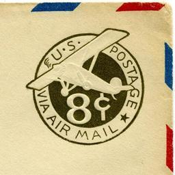 | Keywords: 1932 US Airmail Stamped Envelope Indicium - 8 cents.jpg en 1932 U S airmail stamped envelope indicium - 8 cents denomination 1932 U S Post Office Department scan of stamped envelope owned by contributor U S Post Office Department PD-USGov Uploaded with UploadWizard Cut squares of the United States |
