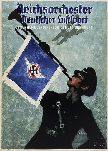 Keywords: 1934 Jupp Wiertz Plakat Reichsorchester Deutscher Luftsport - Generalmusikdirektor Schulz-Dornburg, Deutscher Luftsport-Verband (DLV), Berlin, Röderdruck Leipzig.jpg Plakat in den Maßen circa 89 3 x 63 8 cm gedruckt von Röderdruck Leipzig entworfen 1934 von Jupp Wiertz für den Deutschen Luftsport-Verband DLV mit Sitz in Berlin Hinter dem Text Zitat Reichsorchester // Deutscher Luftsport // Generalmusikdirektor Schulz-Dornburg ist ein fliegender Doppeldecker zu sehen im Vordergrund ein junger Mann in Uniform mit Trompete und Banner des Verbandes mit einem Hakenkreuz http //www plakatkontor de/ivpda-poster-show/wiertz-jupp-reichsorchester-deutscher-luftsport html 1934 Jupp Wiertz PD-old Jupp Wiertz Rudolf Schulz-Dornburg Röderdruck Leipzig Deutscher Luftsportverband Rudolf Schulz-Dornburg 1934 posters Biplanes in art Swastikas in advertising Swastikas on military insignia Flags of the Third Reich Air recognition swastika Trumpet players in art |