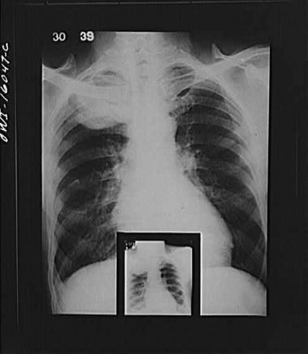 Keywords: 1939 X-ray of active tuberculosis condition.jpg Detroit Michigan New method of making x-ray photographs size 4x5 inches instead of larger Used at the Herman Kiefer Hospital for Communicable Diseases to show various stages of tuberculosis X-ray photograph of active tuberculosis condition Siegel Arthur S photographer Credits Library of Congress Prints Photographs Division FSA-OWI Collection LC-USW3-016047-C ;CREATED/PUBLISHED 1939 ;NOTES Transfer; United States Office of War Information Overseas Picture Division Washington Division; 1944 ;SUBJECTS Safety film negatives United States--Michigan--Wayne County--Detroit ;MEDIUM 1 negative safety ; 4 x 5 inches or smaller ;CALL NUMBER LC-USW3- 016047-C ;REPRODUCTION NUMBER LC-USW3-016047-C DLC b w film neg ;PART OF Farm Security Administration - Office of War Information Photograph Collection Library of Congress ;REPOSITORY Library of Congress Prints and Photographs Division Washington D C 20540 ;DIGITAL ID intermediary roll film fsa 8d13320 http //hdl loc gov/loc pnp/fsa 8d13320 esto se puede dar mancomunadamente ev mayores de52 PD-USGov X-rays of lung tuberculosis History of Detroit Michigan Hospitals in Michigan Arthur Siegel 1939 in Michigan