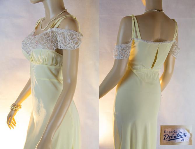 | Keywords: 1940′s nightgown / nightie in slinky soft luxurious light lemon rayon, bias cut at the hem and with an empire waist. The bust is of off the shoulder white lace, with ribbon on the shoulder. Best of all, this adorably luxurious nightgown is unworn, new with tag. So lovely – so wearable. The Ametex trademark was first filed in 1944 by the American Textile Company, Inc. dreamdate emmaatdreamdate silkynighties | ||||