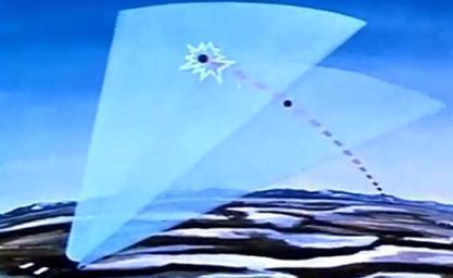 Keywords: 1961 Eyes of the North - minute 4-51 -- BMEWS arcs and Q points.png en The Thule J-site BMEWS station's detection arcs of 200°<ref> Cite news Hanley Charles J--Associated Press August 17 1987 Soviets Eskimos protest Thule radar http //news google com/newspapers nid 1454 dat 19870817 id X0lOAAAAIBAJ sjid EBQEAAAAIBAJ pg 6837 867926 Google news archive Star-News 2014-03-09 The radar a Phased Array Warning System ¦can see 3 200 miles 200 miles farther than the old system and has a 240-degree arc ¦40 degrees more than the old </ref> was a missile warning fence created by 4 radars' separate arcs each AN/FPS-50 created 2 arcs shown centered at 3 5° and 7° elevation BMW exagerated in illustration Each arc was created by a smaller radar beam ~1° wide x 3 5° high at a horizontal sweep rate ¦fast enough that a missile or satellite cannot pass through ¦undetected BMW e g Lower Fan and Upper Fan --concerns in 1962 of ERBM's Extended Range Ballistic Missiles were that missile speeds after burnout would be higher than the initially-deployed Soviet ICBMs NORAD1958B and prevent the sweeping fans revisit time of 2 sec Skolnik from detecting the missiles A missile within the lower arc ~1 75-5 25° elevation would be detected at a Lower Fan Q Point black dot and then by the upper fan black dot with jagged outline which allowed the impact area to be estimated from where the object crossed the two fans and the elapsed time interval between fan crossings BMW displays showed the uncertain impact point as an elliptical area The free flight range of the missile outside the atmosphere burnout to reentry depends on the flight path angle and on the missile's parametric value of Q calculated from altitude and speed--additional ballistic range within the atmosphere to an estimated burst altitude was determined from computerized look-up tables in the Missile Impact Predictor BMW Eyes of the North film USAF 1961 Images from the US Air Force PD-USGov |