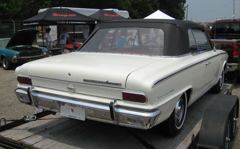 Keywords: 1965 Rambler American 440 convertible white mdD-2.jpg en 1965 Rambler American 440 convertible - a compact car produced by American Motors Corporation AMC This white two-door ragtop features AMC's entirely new 232 cu in 3 8 L straight-6 engine that AMC would use through 1979 and then continue being built through 2006 in different displacements including the 4 0 L Jeep engine under AMC and later Chrysler Photograph taken in the vendor's area at Potomac Ramblers Club's 2011 all AMC Drag Race Day held at the Capitol Raceway located in Crofton Maryland own 2011-06-11 CZmarlin ” Christopher Ziemnowicz releases all rights but a photo credit would be appreciated if this image is used anywhere other than Wikipedia Please leave a note at Wikipedia http //en wikipedia org/w/index php title User_talk CZmarlin action edit section new here Thank you thumb left Front right side view thumb center Driver's cockpit dashboard individually adjustable reclining seats thumb left Front end and grill design with factory optional bumper guards thumb center Rear end view with factory optional bumper guards thumb left The Rambler American badge on trunk lid thumb center The American 440 badge on rear fender 1965 AMC automobiles White convertibles Rambler American third generation |