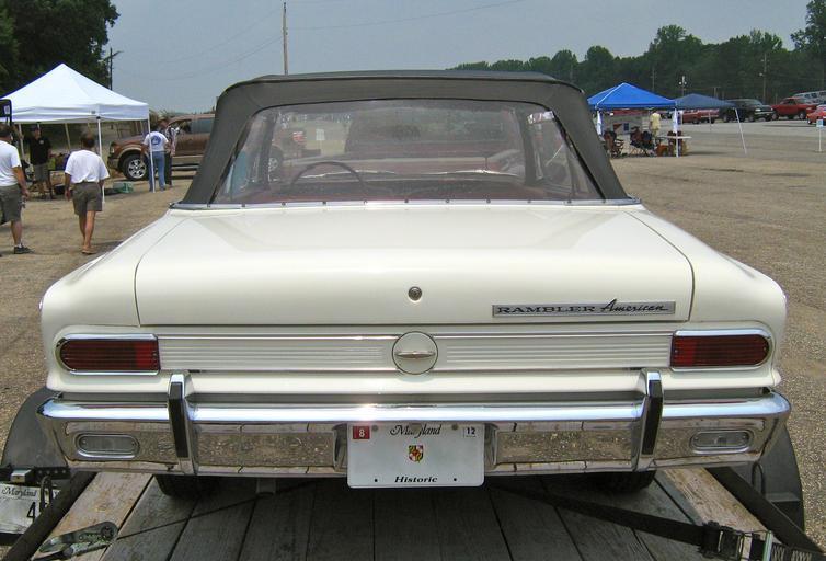 Keywords: 1965 Rambler American 440 convertible white mdD-5.jpg en Rear end view of the 1965 Rambler American - a compact car produced by American Motors Corporation AMC It has the factory optional bumper guards This white two-door convertible is the 440 model and features AMC's entirely new 232 cu in 3 8 L straight-6 engine that AMC would use through 1979 and then continue being built through 2006 in different displacements including the 4 0 L Jeep engine under AMC and later by Chrysler Photograph taken in the vendor's area at Potomac Ramblers Club's 2011 all AMC Drag Race Day held at the Capitol Raceway located in Crofton Maryland own 2011-06-11 CZmarlin ” Christopher Ziemnowicz releases all rights but a photo credit would be appreciated if this image is used anywhere other than Wikipedia Please leave a note at Wikipedia http //en wikipedia org/w/index php title User_talk CZmarlin action edit section new here Thank you thumb left Front right side view thumb center Rear right view thumb left Driver's cockpit dashboard individually adjustable reclining seats thumb center Front end and grill design with factory optional bumper guards thumb left The Rambler American badge on trunk lid thumb center The American 440 badge on rear fender Rambler American third generation Rear views of automobiles 1965 AMC automobiles |