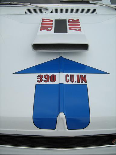 | Keywords: 1969 AMC SC-Rambler md-D4.jpg en Detail of the standard functional hood scoop on the 1969 SC/Rambler - a compact two-door hardtop muscle car produced by American Motors Corporation AMC in collaboration with Hurst Performance This two-door hardtop body style no B pillar was a special low-priced factory-ready Stock Car model designed to to showcase AMC in performance and drag racing Each Hurst SC/Rambler came equipped with AMC's 315 hp 235 kW; 319 PS 390 cu in 6 4 L AMC V8 engine from the AMX and only with a four-speed manual transmission with Hurst shifter as well as a standard 3 54 1 Twin-Grip limited slip differential This car has the A paint scheme Photograph taken at Potomac Ramblers Club's 2011 all AMC Drag Race Day held at the Capitol Raceway an NHRA sanctioned 1/4 mile asphalt and concrete drag strip located in Crofton Maryland own 2011-06-11 CZmarlin ” Christopher Ziemnowicz releases all rights but a photo credit would be appreciated if this image is used anywhere other than Wikipedia Please leave a note at Wikipedia http //en wikipedia org/w/index php title User_talk CZmarlin action edit section new here Thank you thumb left Front right side view thumb center Driver's cockpit and dashboard with the factory standard Sun brand tachometer strapped to the steering column thumb left Detail of standard rear view mirror thumb center Returning from a run down the drag strip thumb left The SC/Rambler's standard red/white/blue headrests on individually adjustable reclining front seats AMC SC/Rambler Hood scoops |