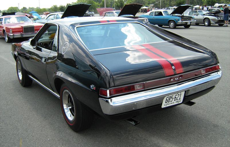 | Keywords: 1969 AMX black with red stripes VA r.jpg en 1969 AMX by American Motors Corporation AMC A two-seat GT-type sports coupe Finished in Classic Black with red stripes This car has the optional 390 Go Package that included the 390 cu in 6 4 L 315 hp 235 kW V8 engine racing stripes over the hood roof and trunk power disk brakes front Twin-Grip differential heavy-duty cooling including a seven-blade flex fan and shroud as well as a 140-mph 225-km/h speedometer and styled steel Magnum 500 wheels with bright trim rings The high-performance E70x14 red stripe wide-oval tires are correct factory standard equipment for this year own 2010-06-19 CZmarlin ” Christopher Ziemnowicz releases all rights but a photo credit would be appreciated if this image is used anywhere other than Wikipedia Please leave a note at Wikipedia http //en wikipedia org/w/index php title User_talk CZmarlin action edit section new here Thank you en I the copyright holder of this work hereby release it into the public domain This applies worldwide thumb left View of the front thumb center View of the side thumb left View of the red racing stripes AMC AMX 1969 AMC automobiles Black coupes |