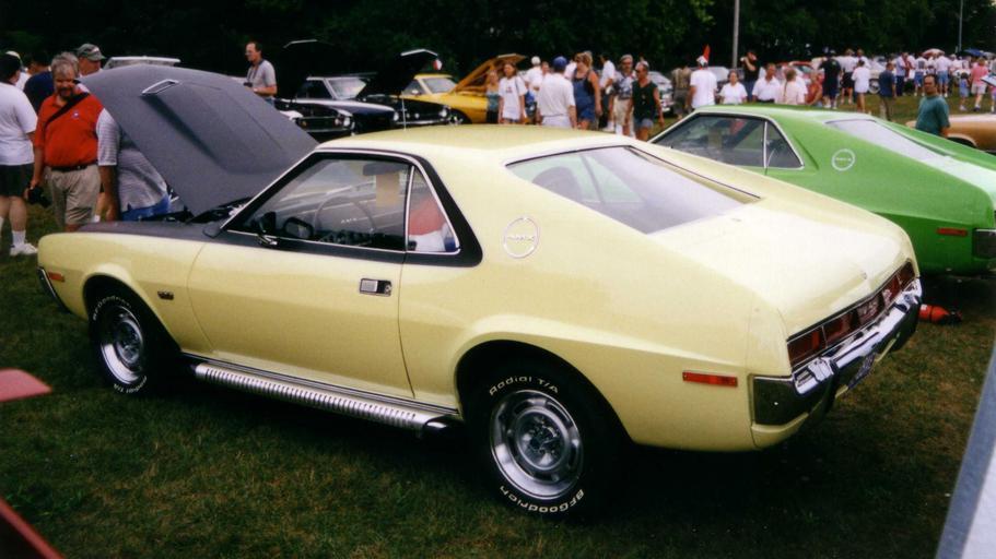 | Keywords: 1970 AMX yellow with black shadow mask.JPG 1970 AMC American Motors Corporation AMX sports coupe finished in yellow with the black shadow mask option Factory 390 6 4 L Go Package This car also has the optional 15-inch Machine wheels and side-pipe exhaust system own CZmarlin ” Christopher Ziemnowicz releases all rights but a photo credit would be nice if this image is used anywhere other than Wikipedia Uploaded on 2008-09-06 AMC AMX 1970 AMC automobiles Yellow coupes | ||||
