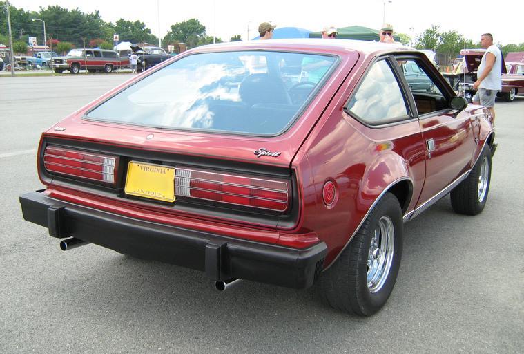 | Keywords: 1979 AMC Spirit GT V8 Russet RR.jpg en 1979 AMC Spirit GT A subcompact 2-door liftback with factory 304 CID 5 0 L V8 engine and four-speed manual transmission Finished in Russet Metallic own 2010-06-19 CZmarlin ” Christopher Ziemnowicz releases all rights but a photo credit would be appreciated if this image is used anywhere other than Wikipedia Please leave a note at Wikipedia http //en wikipedia org/w/index php title User_talk CZmarlin action edit section new here Thank you en I the copyright holder of this work hereby release it into the public domain This applies worldwide thumb left Left rear thumb center Right front thumb left Rear view aftermarket dual tail pipes thumb center Front view thumb left Side left aftermarket wheels thumb center The standard V8 engine thumb left Driver's perspective of the steering wheel and instrument panel thumb center Standard interior with GT package and center console Rallye Gauges and four-speed transmission thumb left Spirit GT emblems on front fender 1979 AMC automobiles AMC Spirit Red coupes |