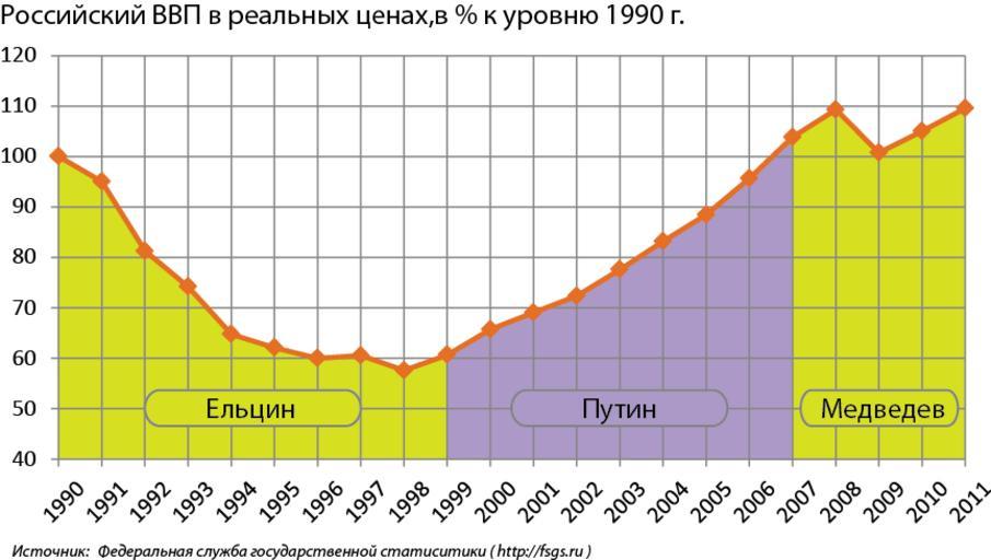 | Keywords: ВВП РФ с 1990 по 2011 гг.png  disputed diagram ru ВВП РФ в  еальных ценах в к у овню 1990 г согласно данным Росстата <br />1 данные за 1996-2002гг не пе есмат ивались и не сопоставимы с данными за 2003-2012 гг 2012-02-01 own Zarutskij Svyatoslav Data Note Indices of real GDP growth according to RosStat<br /> Источники <br /> С 1991 по 2000<ref>http //www gks ru/doc_2001/year01/year01 arj Российский статистический ежегодник 2001г </ref><br /> С 2000 по 2009<ref>http //www gks ru/bgd/regl/b10_13/ Российский статистический ежегодник 2010г </ref><br /> С 2010 по 2011<ref>http //www gks ru/free_doc/new_site/vvp/tab3 xls Индексы физического объема к п едыдущему году </ref><br /> wikitable style text-align right; Year Growth - 1991 95 - 1992 85 5 - 1993 91 3 - 1994 87 3 - 1995 95 9 - 1996 96 6 - 1997 100 9 - 1998 95 1 - 1999 105 4 - 2000 108 3 - 2001 105 1 - 2002 104 7 - 2003 107 3 - 2004 107 2 - 2005 106 4 - 2006 108 2 - 2007 108 5 - 2008 105 2 - 2009 92 1 - 2010 104 3 - 2011 104 3 П имечания references Economic charts of Russia Uploaded with UploadWizard |