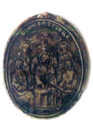 | Keywords: Медальон сторона1.jpg  en Medallion of 19th century showing an orthodox icon of Holy Trinity obverse which was found in Yurtaukh Chechnya Russia ru  едальон XIX века с копией п авославной иконы Т оицы лицевая сто она найденный в Ю таухе в Чечне Own Даги ов Ума 2010 04 3 20 PD-old Medallions Holy Trinity Medals of Russia Religious medals Oval medals |
