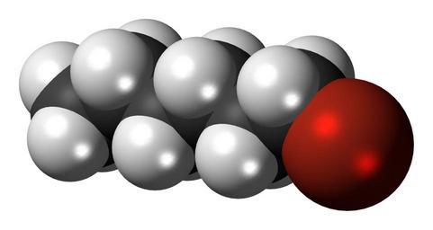 Keywords: 1-Bromohexane-3D-spacefill.png Space-filling model of the 1-bromohexane molecule an haloalkane Colour code 505050 Carbon C black<br> F0F0F0 Hydrogen H white<br> B42814 Bromine Br red-brown<br> 2011-02-19 own DS Visualizer Jynto talk Ball-and-stick version cc-zero 1-bromohexane Images by Jynto Space-filling models |