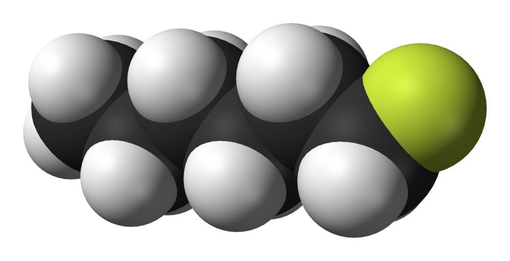 | Keywords: 1-fluorohexane-3D-sf.png Space-filling model of the 1-fluorohexane molecule C<sub>6</sub>H<sub>13</sub>F Colour code 393939 Carbon C grey-black FFFFFF Hydrogen H white D4F03F Fluorine F yellow-green This image is not based on an experimental structure determination but a search of the CSD for 1-fluoroalkyl groups returned crystal structures with a variety of fluoroalkyl conformations The conformation chosen here is one in which the atoms C3 “C2 “C1 “F are all coplanar with C3 “C2 and C1 “F bonds antiperiplanar Image generated in http //accelrys com/products/discovery-studio/visualization/discovery-studio-visualizer html Accelrys DS Visualizer Own 2012-12-23 Ben Mills Benjah-bmm27 Images by Ben Mills Space-filling models Fluorohexanes |