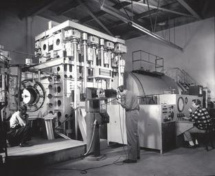 Keywords: blackandwhite black and white (A-13011): This view of the 1- x 3-Foot Supersonic Tunnel No. 2 shows the entire tunnel except its diffuser and exhaust, which are out of the photo to the left. The flexible-wall nozzle dominates this scene, with the test section to its left, and the settling chamber behind the control console to its right. . (A-13011): This view of the 1- x 3-Foot Supersonic Tunnel No. 2 shows the entire tunnel except its diffuser and exhaust, which are out of the photo to the left. The flexible-wall nozzle dominates this scene, with the test section to its left, and the settling chamber behind the control console to its right. .