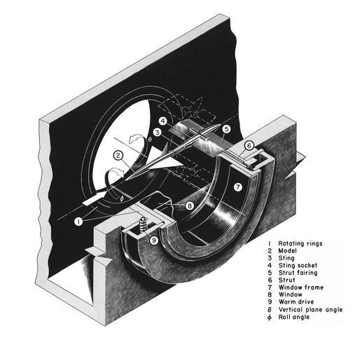Keywords: blackandwhite monochrome white background text illustration black and white (A-21506): Since they used interchangeable test sections, both 1 x 3-foot supersonic tunnels employed the sting arrangement shown here. Note that the strut is attached to dual rings around the observation windows that rotate, turned by a worm-gear drive, to set the desired pitch. (A-21506): Since they used interchangeable test sections, both 1 x 3-foot supersonic tunnels employed the sting arrangement shown here. Note that the strut is attached to dual rings around the observation windows that rotate, turned by a worm-gear drive, to set the desired pitch.