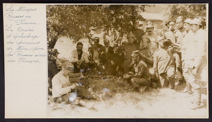 Keywords: photo border outdoor Les troupes russes en France. Corvée d'épluchage de pommes de terre par les russes aidés des français. Les troupes russes en France. Corvée d'épluchage de pommes de terre par les russes aidés des français.