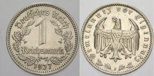 Keywords: 1ReichsMark.JPG 1 Reichsmark Deutsches Reich 1937 Hamburgische Münze J es Moneda de 1 Reichsmark Nazi German 1 Reichsmark German coin Reichsbank photograph by Turkmenistan 1937 Coin PD-GermanGov-currency <br/>Photograph Reichsmark coins of the Third Reich 0100 1937 |