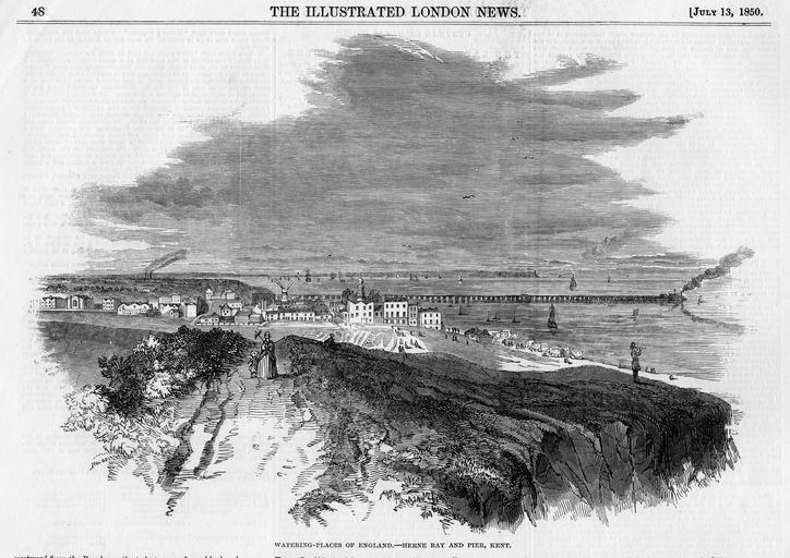 MAKE A MEME View Large Image Herne Bay Pier 1850 001.jpg 1850 lithograph of Herne Bay showing in the background the first wooden Herne Bay pier built 1832 by Thomas Rhodes assistant to Thomas Telford London Illustrated News 1850-07-13 Edmund Evans 1826 “1905 out of ...