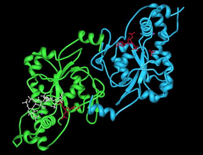 MAKE A MEME View Large Image 1T8U.jpg en Crystal Structure of human 3-O-Sulfotransferase-3 with bound PAP and tetrasaccharide substrate as discerned by Moon et al 2004 PDB 1T8U Enzyme chain A blue Enzyme chain B green PAPS red tetrasaccharide substrate white sodium ion ...