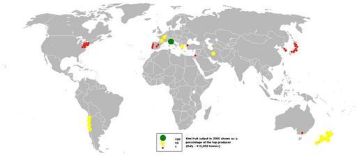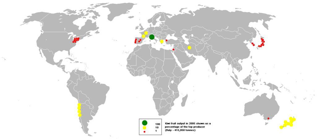Keywords: 2005kiwi fruit.PNG This bubble map shows the global distribution of kiwifruit output in 2005 as a percentage of the top producer Italy - 415 050 tonnes This map is consistent with incomplete set of data too as long as the top producer is known It resolves the accessibility issues faced by colour-coded maps that may not be properly rendered in old computer screens Data was extracted on 9th June 2007 from http //faostat fao org/site/336/DesktopDefault aspx PageID 336 05 38 9 June 2007 w User Anwar_saadat who was the original uploader on Wikipedia economic map Kiwifruits 2005 maps Bubble maps |