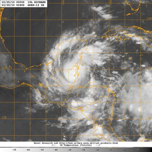 Keywords: 20101025.0045.goes13.x.ir1km bw.19LRICHARD.80kts-981mb-172N-882W.100pc.jpg This is an infrared image of Hurricane Richard at peak intensity and making landfall on Belize taken by the GOES-13 spacecraft Leading up to this photograph Richard had strengthened rapidly and radar imagery showed a closed eyewall In this photo Richard has windspeeds of 90 mph and a minimum pressure of 981 mbar Eventually Richard dissipated in the Bay of Campeche Mouse over the image for information http //199 9 2 143/tcdat/tc10/ATL/19L RICHARD/ir/geo/1km_bw/ 2010-10-25 GOES-13; US Navy PD-USGov-Military-Navy ImageNote 1 666 119 357 203 1024 1024 2 Cuba ImageNoteEnd 1 ImageNote 2 391 329 242 276 1024 1024 2 Hurricane Richard ImageNoteEnd 2 ImageNote 3 806 2 201 116 1024 1024 2 South Florida ImageNoteEnd 3 ImageNote 4 314 486 174 227 1024 1024 2 Guatemala ImageNoteEnd 4 ImageNote 5 565 323 29 24 1024 1024 2 Cozumel ImageNoteEnd 5 ImageNote 6 427 654 171 94 1024 1024 2 El Salvador ImageNoteEnd 6 ImageNote 7 464 577 328 125 1024 1024 2 Honduras ImageNoteEnd 7 ImageNote 8 502 643 311 227 1024 1024 2 Nicaragua ImageNoteEnd 8 ImageNote 9 836 341 150 101 1024 1024 2 Cayman Islands ImageNoteEnd 9 ImageNote 10 614 853 237 102 1024 1024 2 Costa Rica ImageNoteEnd 10 ImageNote 11 2 2 321 49 1024 1024 2 Date and Subject Information ImageNoteEnd 11 ImageNote 12 2 956 1021 34 1024 1024 2 Information ImageNoteEnd 12 ImageNote 13 2 997 1021 22 1024 1024 2 Infrared Legend ImageNoteEnd 13 ImageNote 14 459 445 65 114 1024 1024 2 Belize ImageNoteEnd 14 ImageNote 15 7 585 309 370 1024 1024 2 Pacific Ocean ImageNoteEnd 15 ImageNote 16 290 683 360 270 1024 1024 2 Pacific Ocean ImageNoteEnd 16 ImageNote 17 585 270 432 338 1024 1024 2 Caribbean Sea ImageNoteEnd 17 ImageNote 18 7 212 384 237 1024 1024 2 Bay of Campeche ImageNoteEnd 18 ImageNote 19 783 616 237 311 1024 1024 2 Caribbean Sea ImageNoteEnd 19 ImageNote 20 20 53 787 162 1024 1024 2 Gulf of Mexico ImageNoteEnd 20 ImageNote 21 9 259 302 401 1024 1024 2 Mexico ImageNoteEnd 21 ImageNote 22 370 266 179 203 1024 1024 2 Yucatan Peninsula ImageNoteEnd 22 Hurricane Richard 2010