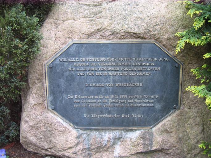 | Keywords: 2010-05-11 Vlotho 160.jpg Gedenkstein für die zerstörte Synagoge in Vlotho Kreis Herford Nordrhein-Westfalen in Vlotho District of Herford North Rhine-Westphalia Germany TUBS/Translation own IXUS 500 2010-05-11 TUBS 52 10 10 14 N 8 51 48 09 E region DE_heading NE self TUBS TUBS/licensesection Attribution TUBS/Credits Memorials in Vlotho Holocaust memorials in North Rhine-Westphalia Vlotho Richard von Weizsäcker c Plaques in Vlotho Reliefs in Vlotho Synagogues in Kreis Herford Vlotho Churches in Vlotho Memorials dedicated to demolished synagogues in North Rhine-Westphalia Vlotho Plaques referencing 1938 Vlotho Photographs taken on 2010-05-11 Vlotho |