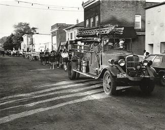 | Keywords: fire protection fireprotection parades 1970s outdoor Photograph of members of the Deseronto Fire Department and its 1929 fire truck taking part in the Centennial Parade held in Deseronto, Ontario, on Thursday, 17th June, 1971. Taken on Main Street, outside the Legion.  From a collection of materials relating to the 1971 centennial of Deseronto's incorporation as a village.  Photograph believed to have been taken by Lloyd Thompson for The Quinte Scanner. Photograph of members of the Deseronto Fire Department and its 1929 fire truck taking part in the Centennial Parade held in Deseronto, Ontario, on Thursday, 17th June, 1971. Taken on Main Street, outside the Legion.  From a collection of materials relating to the 1971 centennial of Deseronto's incorporation as a village.  Photograph believed to have been taken by Lloyd Thompson for The Quinte Scanner.  |