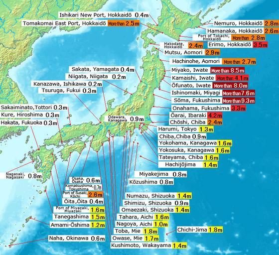 | Keywords: 2011 Tohoku earthquake observed tsunami heights en.png en Map of 2011 Tohoku Sendai earthquake observed tsunami heights in Japan ja 北 方太平洋沖 で観測された 日 各 の津波の高さ 英語版 2011 Tohoku earthquake observed tsunami heights png JMAhttp //www jma go jp/jp/tsunami/observation_04_20110313180559 html 1 http //www jma go jp/jma/press/1103/14c/tsunami_onahama html 2 http //www jma go jp/jma/press/1103/23b/tsunami_miyako_ofunato html 3 http //www jma go jp/jma/press/1103/29c/201103291900 html 4 map http //www demis nl/home/pages/Gallery/examples htm demis Original by Pekachu translated by Eastwind41 2011-05-14 Pekachu PD-Demis SVG re-designed version available<br>120px Retouched picture Place name translating to English language 名の英訳 Maps and diagrams of the 2011 Tōhoku earthquake |
