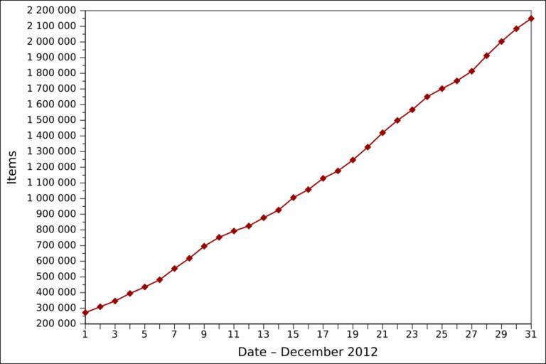 Keywords: 2012-12 Wikidata items EN.svg de Grafische Darstellung des vollständigen Anzahls der angelegten Gegenstände auf Wikidata in Dezember 2012 auf Englisch Löschungen werden nicht berücksichtigt en Graph presenting the total number of items created on Wikidata as of December 2012 in English Item deletions are not taken into account fr Graphique en anglais représentant le nombre total d'éléments créés sur Wikidata en décembre 2012 Les suppressions d'éléments ne sont pas prises en compte 2012-12-08 15 19 01 own Ljubinka cc-zero de inline yes File 2012-12 Wikidata items DE svg fr inline yes File 2012-12 Wikidata items FR svg Wikidata statistics in December 2012 Wikidata statistics in English